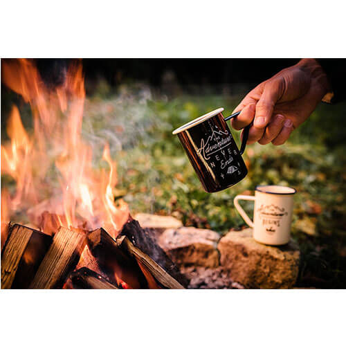Set of two tall versions of the classic Gentlemen's Hardware enamel mug. Comes in cream and black. Reads "The Adventure Begins" and "The Adventure Never Ends" respectively.