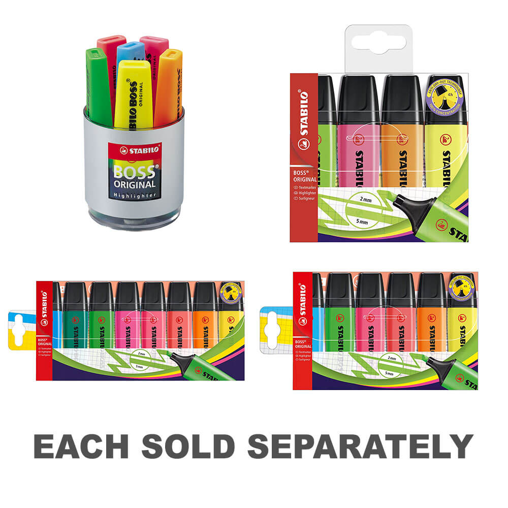 These markers feature a beveled tip that allows for two different line widths and a distinctive design that fits perfectly in the hand and prevents them from moving. Vibrant water-based ink is suitable for paper, copies or faxes. Don't worry if you accidentally forget to put the lid back on. They can be left uncovered for up to 4 hours without drying. Set colors include one of each green, orange, pink, and yellow.