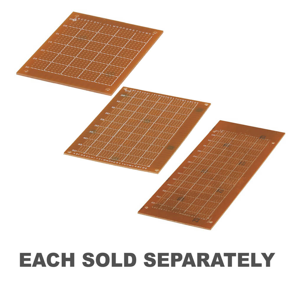The low cost way to build prototypes. Each donut is separated from its neighbours by about a 0.5mm gap. This effectively isolates each pad but also makes it easy to bridge solder across to make interconnections. Each board also has `fingers' on opposite ends with a 3.6mm edge pitch. These can be used to connect to and from the board or to a card edge connector. Finally the non- solder side of the board has an alpha- numeric grid printed on it to assist in component identification board layout.
