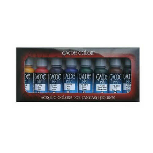 Collection of 8 color sets of Game Color for painting models and miniatures. Each one of these sets has a selection of special colors for paiting figures, etc. Contains 8 bottles of 17 mL. (with eyedropper) and color chart. Colors 72.140 Heavy Skintone 72.141 Heavy Red 72.142 Heavy Violet 72.143 Heavy Blue 72.144 Heavy Bluegrey 72.145 Heavy Grey 72.146 Heavy Green 72.147 Heavy Blackgreen