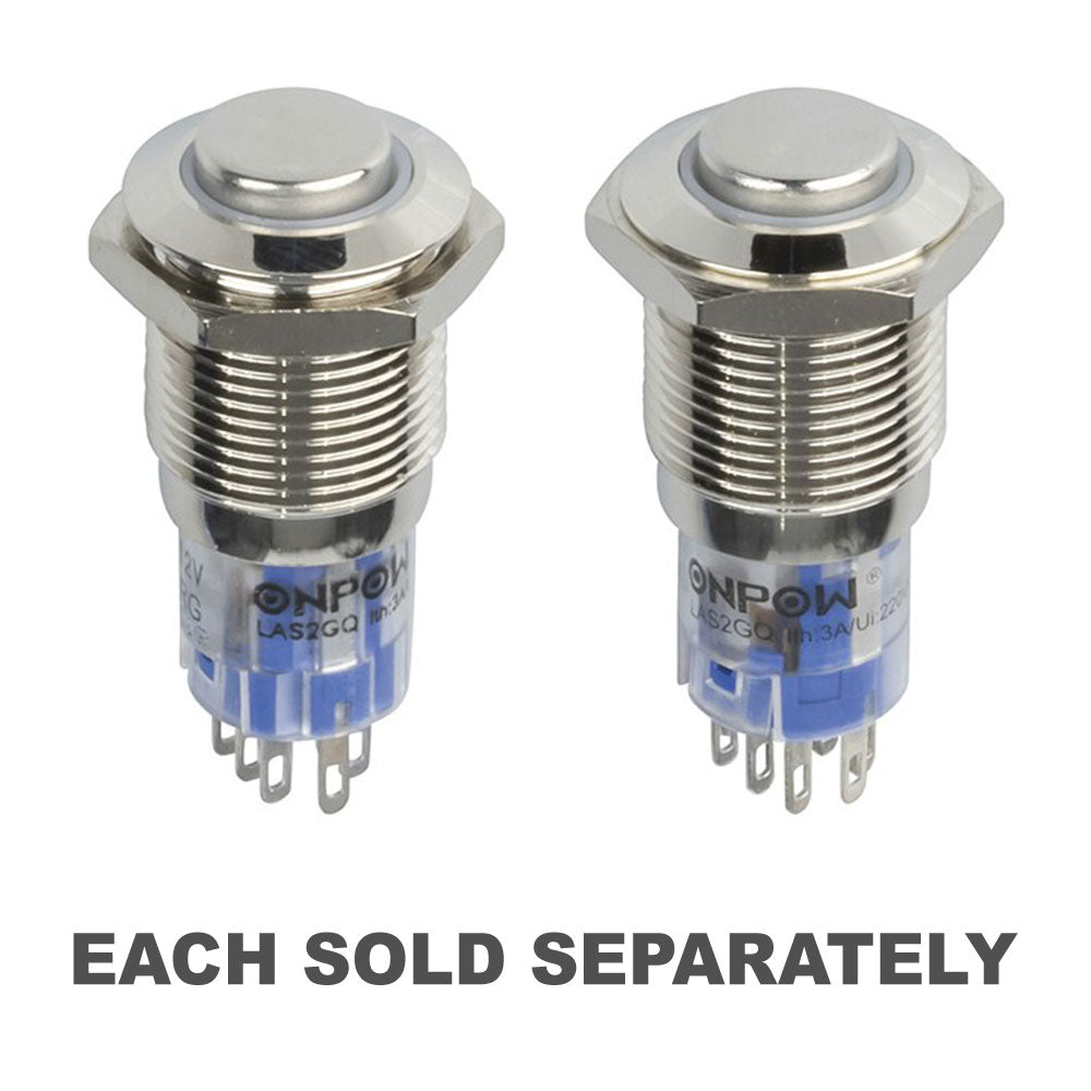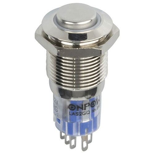 Interruptor con clasificación IP67 para uso industrial u otros entornos duros. Dual color rojo/verde iluminado, cuerpo de metal, dpdt, acción momentánea.