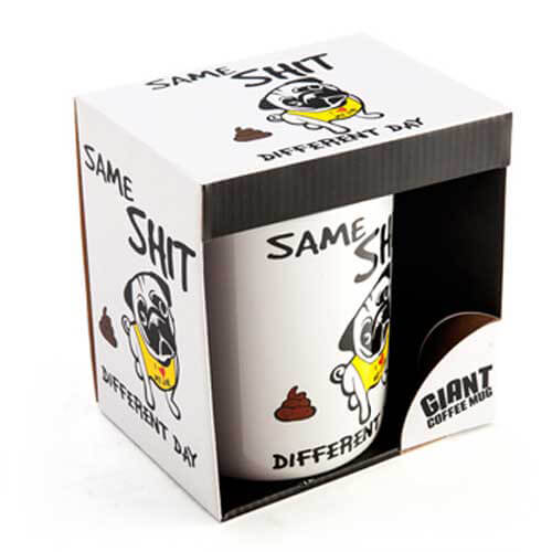 - Featuring a cute little pug on a real big mug to get you through another one of those days