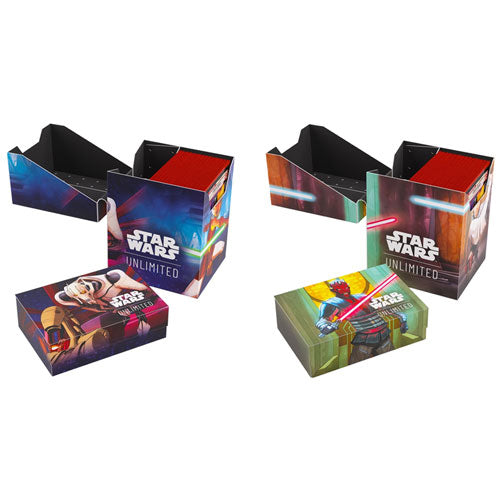 The Star Wars: Unlimited Soft Crate is the all-in-one casual solution for Star Wars: Unlimited players. This full color printed and officially licensed deck box is packed with ingenious features. It protects a full double-sleeved deck of cards and includes an innovative token box! This token box has a smart click-lock mechanism to keep all tokens safely stored – even while pulling it out. Once opened, the lid of the box stays upright for convenient access during gameplay.