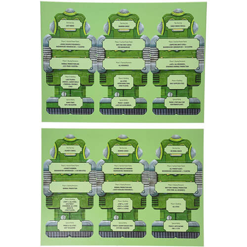 • Il robot è composto da cinque tessere, una piastrella con regole per ogni fase più un'abilità speciale, che il robot utilizza durante il gioco.