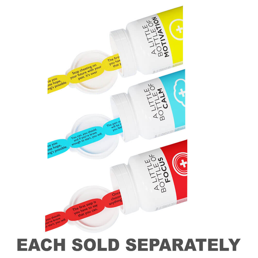- ボトルには、精神的な焦点を改善し、集中力を訓練するように設計された52個の錠剤型の紙の引用が含まれています!