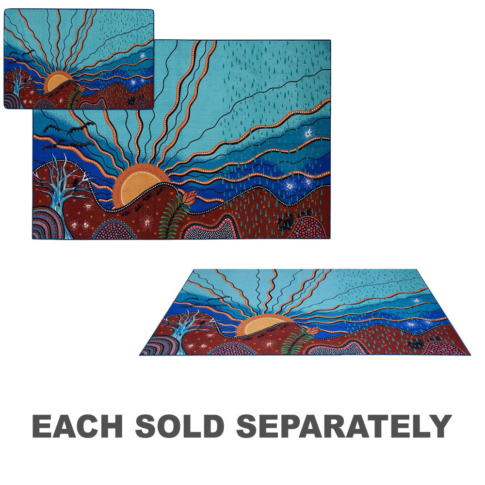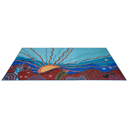 The Seasons Classroom Rug is a unique collaboration between First Nation artist DJ Mate and Elizabeth Richards. A truly beautiful classroom rug that gives kids space to ask questions, listen to stories and learn about Country.