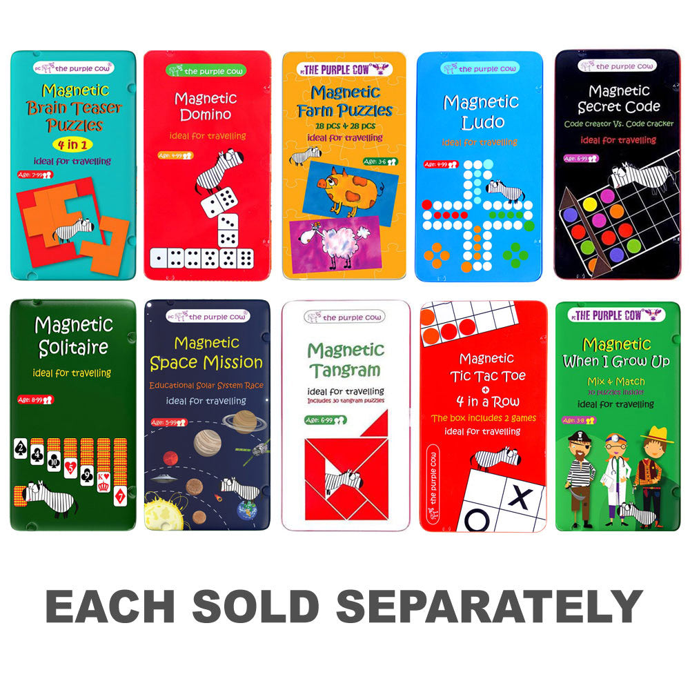 DOMINOES is a family of games using the "Western" style tiles. The standard set of tiles is based on the 21 different combinations made with a roll of two six-sided dice. Seven (7) additional "Blank" combination tiles combine with the 21 to form the standard 28 "Double-Six" set. "Double-Nine" (with 55 tiles) and "Double-Twelve" (with 91 tiles) are also popular. "Double-Fifteen" sets with 136 tiles also exist. Compact and chique, a variety of classic board games designed in a slim tin case, printed both sides with magnetic pawns and pieces. Fun and affordable travel games, for all ages.