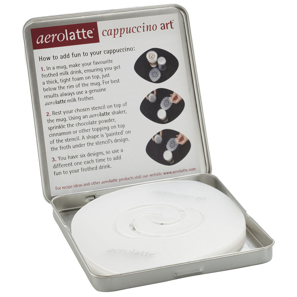 Creëer barista-achtige ontwerpen voor uw favoriete warme dranken thuis met behulp van de leuke cappuccino-kunststencils van Aerolatte.