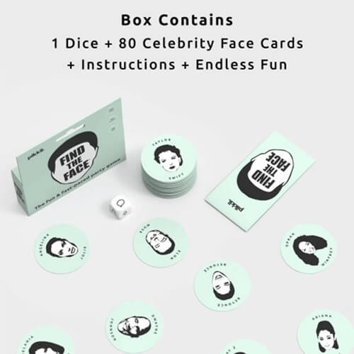 Het leuke en snelle spel van het vinden van de beroemde gezichten als eerste. Bevat: 1 dobbelstenen, 80 beroemde gezichtskaarten, instructies en eindeloos plezier!