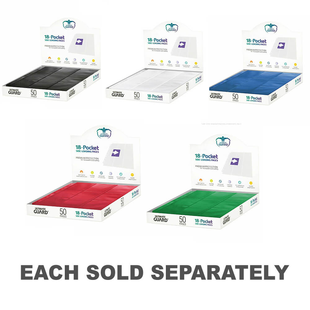 Hoogwaardige, dubbelzijdige pocketpagina's (9 zakken aan elke kant), die in bijna elke D-ring-binder passen, voor het opslaan en weergeven van maximaal 18 kaarten met dubbele mouwen per pagina. 50 pagina's per verpakking.
