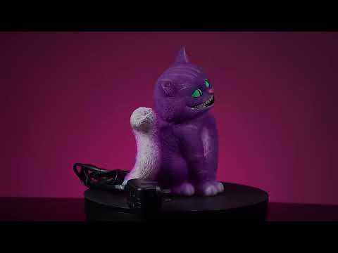 LED -bordlampe av en flirende gal katt med livlige turkise øyne. Gjør et unikt ornament på dagtid og lyser opp rommet om natten. Lavspenning ledet trygt for barn.