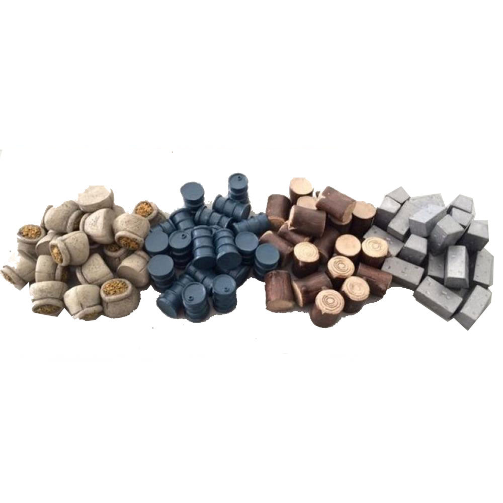 • Inkludert er 80 symboler: 20 kornsekker (mat), 20 jerninngående (metall), 20 oljefat (olje), 20 hakket tre (tre)