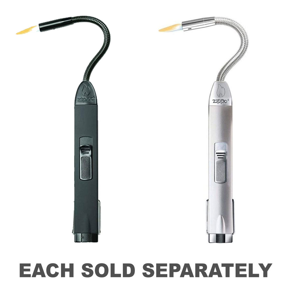Zippo fleksibel nakke utendørs verktøy lettere er flat svart aluminiumskonstruksjon med gummierte innlegg. Vindresistent dobbel flammeknologi. Fleksibel utvidet nakke, toppet av en slank, kraftig dyse, passer enkelt til alle lysåpninger. Avansert tenningssystem. Indikator på drivstoffnivå. Justerbar flammepatenterte barnesistente sikkerhetsknapp. Rustfri hengende sløyfe. Ideell for camping, lykter, peiser, tiki fakler, griller, bål og mer. Standard case -form med avrundede hjørner og topp med en flat bunn. Et fem-tønne hengsel blir med på toppen og bunnen. Den har et standardinnsats med 16 hull i skorsteinen (8 per side). Bunnen er stemplet med Zippo -logo fra perioden autentiserer disse lightere som ekte Zippo.