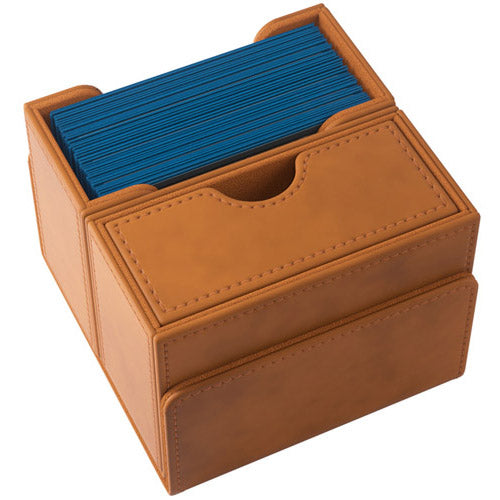UNIQUE FEATURE: The innovative drawer compartment can easily be tilted to the side for convenient access to the pull-out drawer for tokens and accessories! The flap of the Deck Wallet is equipped with our highly rated CONVERTIBLE system. Strong magnets keep the setup stable and close the box safely. This premium deck box comes in a stylish and adventurous appearance with hot-stamped and foiled logos