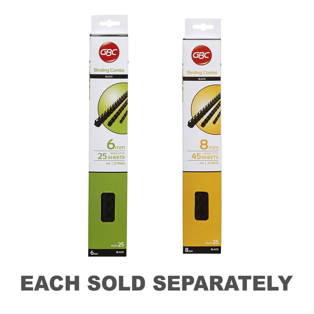These GBC Plastic Binding Combs are strong and durable and add a great finishing touch to a range of documents including presentations, reports and projects for school or home office use. The 6 mm GBC Plastic Binding Combs have 21 loops that securely holds up to 25 sheets of A4 paper.