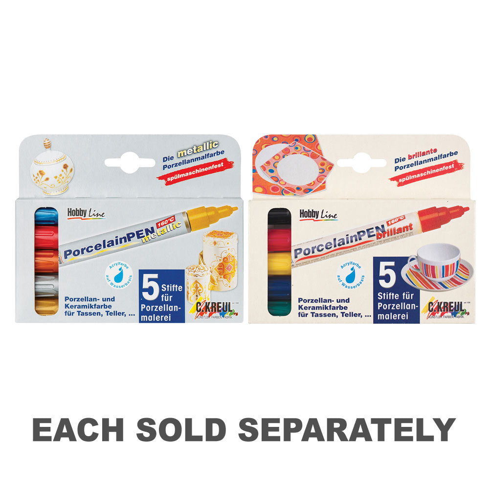 Porcelain Markers Metallic 5's. Create stunning, long-lasting designs on porcelain, glass, and ceramic surfaces with these water-based, felt-tipped metallic markers. Once your design is finished, simply cure by baking in a kitchen oven for 90 minutes at 160°C to ensure permanence. This pack includes 5 radiant metallic colours: silver, red, gold, blue, and copper. Each marker has a 2-5mm bullet tip, allowing for both precise detailing and bold strokes.