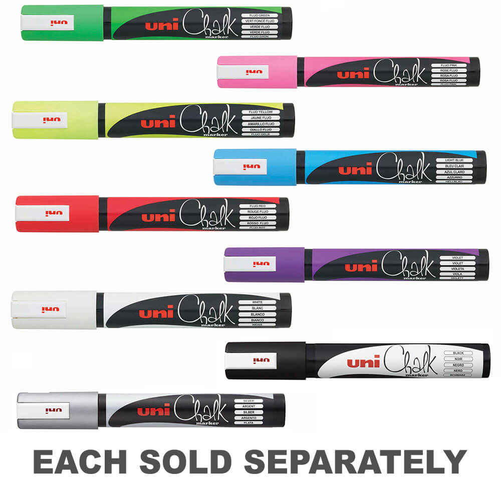 Uni Liquid Chalk Markers utilise water-based pigment ink so you can mark on windows, glass, mirrors, plastic and metal surfaces with ease. The ink won't wash off in the rain, yet is easy to remove with a damp cloth. For permanent application the markers can also be used on chalkboards for a bold statement.