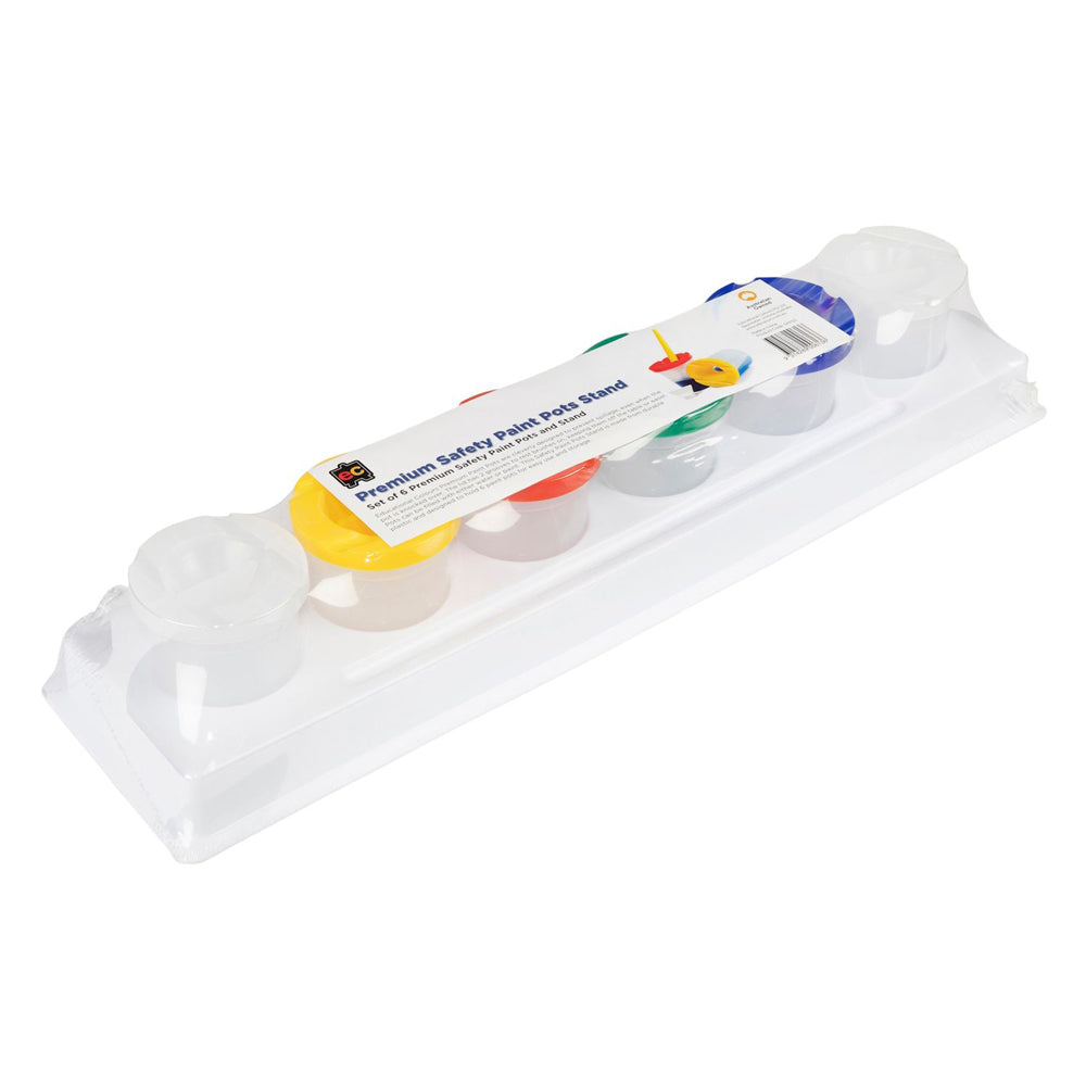 The Premium Safety Paint Pot Stand Set is a quintessential addition for both classroom and home art settings. Included are 6 Premium Paint Pots, each ingeniously designed to counter spills, ensuring a mess-free experience even if they're inadvertently knocked over.