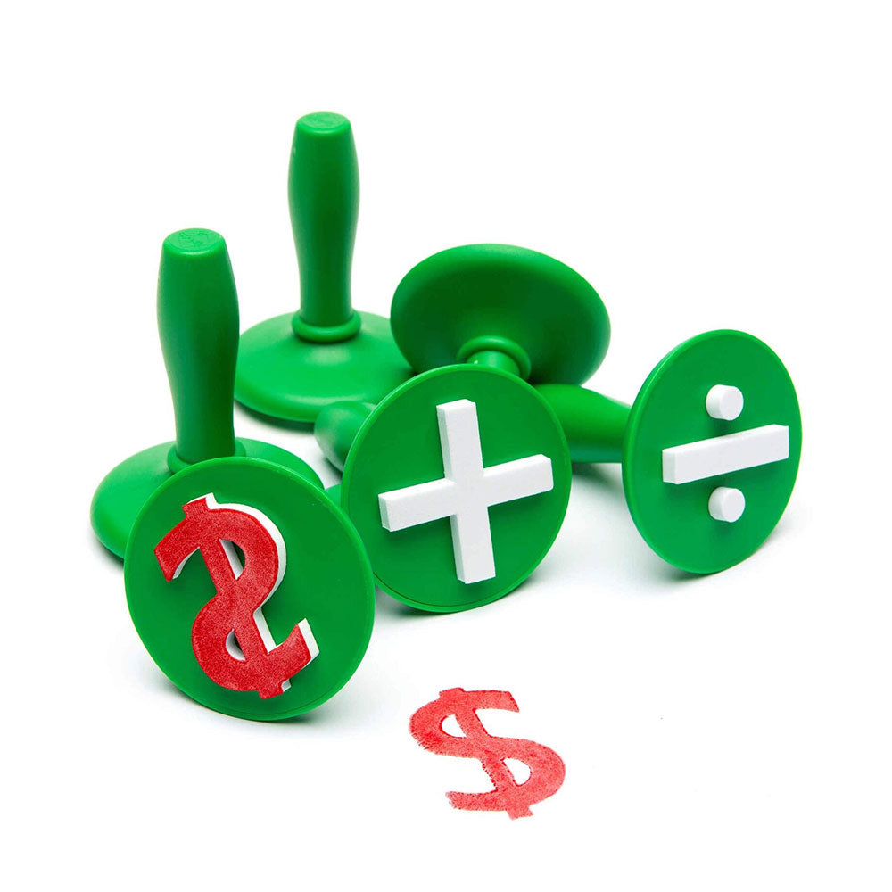 • Denna uppsättning av 6 matematiska stämpel ger ett roligt, praktiskt sätt att lära sig om matematiska symboler.