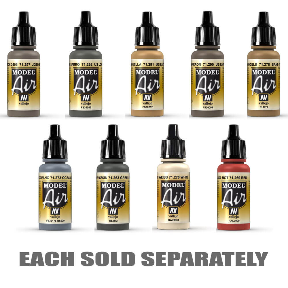 Model Air är ett antal flytande akrylfärger utvecklade speciellt för luftborsttekniker, med mycket finmalda pigment och ett akrylharts med egenskaper av extremt motstånd och hållbarhet. Formeln innehåller ett nytt akrylharts med egenskaper fram till nu omöjligt att få i en vattenbaserad akryl. Motståndets motstånd, hårdhet och täckning är överlägsen alla kända akryl för luftborstning. Pigmenten som används för luftbrushfärger måste malas till den finaste möjliga konsistensen för att undvika hindring av luftbrushventilerna. Den revolutionära fräsningsprocessen för pigmenten som används i Model Air -formeln ger modellmålaren teknisk försäkring och finaste struktur när du applicerar färgerna på modellen och producerar en mycket överlägsen kvalitet när du applicerar färgerna med en borste för minuscule detaljer, för tvätt och Öppenhet och skiktad applicering av utspädda glasurer